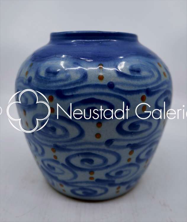 « Vase à décor de points bleus et rouges et frises sur fond bleu clair » vers 1900 / 1919 - Hauteur : 15cm et diamètre : 12cm | Consulter ›› |
