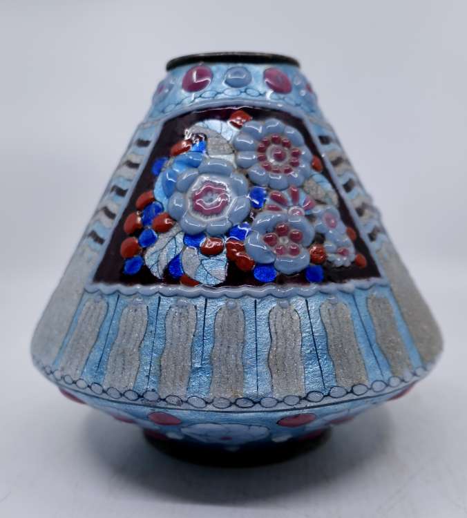 « Vase tronconique en laiton émaillé » vers 1925 - Hauteur : 18cm et diamètre : 18,5cm | Consulter ›› |