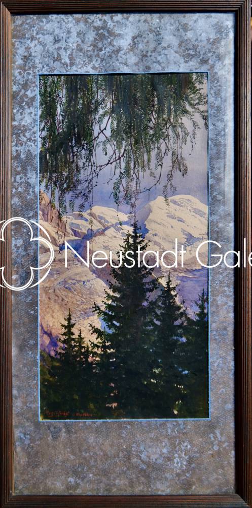Les masses profondes des conifères, traitées par des lavis saturés et ponctuées de touches calligraphiques, contrastent avec la blancheur lumineuse des sommets enneigés. Herbst use ici avec une grande maîtrise des ressources propres à l’aquarelle : réserves du papier pour la neige éclatante, glacis translucides pour les ombres bleuâtres des glaciers, superpositions subtiles pour suggérer la profondeur atmosphérique. La montagne est rendue avec retenue, presque en suspension, baignée d’une lumière froide et diffuse.