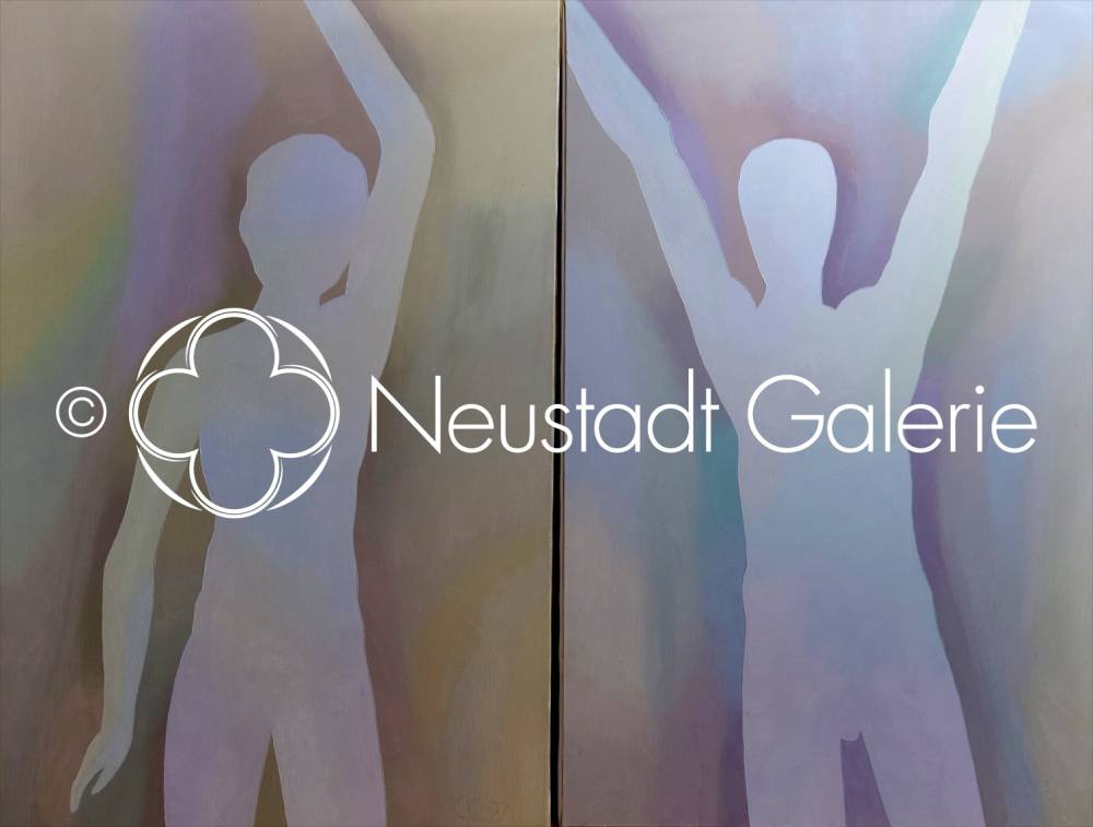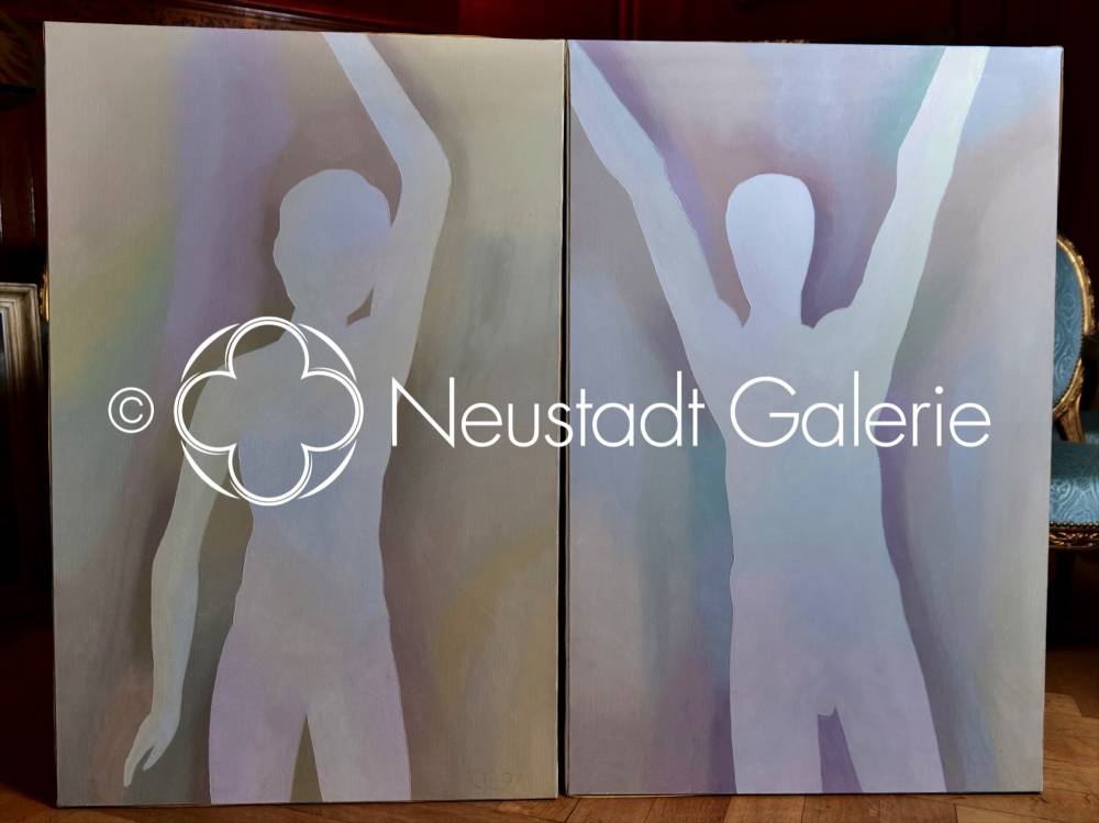 La composition du diptyque repose sur un jeu de correspondances et de tensions. Les deux figures, bien que séparées par la césure matérielle des toiles, dialoguent par leurs postures levées et leurs gestes ouverts. Les bras, étirés vers le haut, instaurent un mouvement ascensionnel commun, suggérant une quête, une élévation ou un appel. La dissymétrie subtile des attitudes — plus retenue chez la figure féminine, plus expansive chez la figure masculine — nourrit une lecture dialectique de l’ensemble, sans jamais tomber dans l’illustration narrative.
