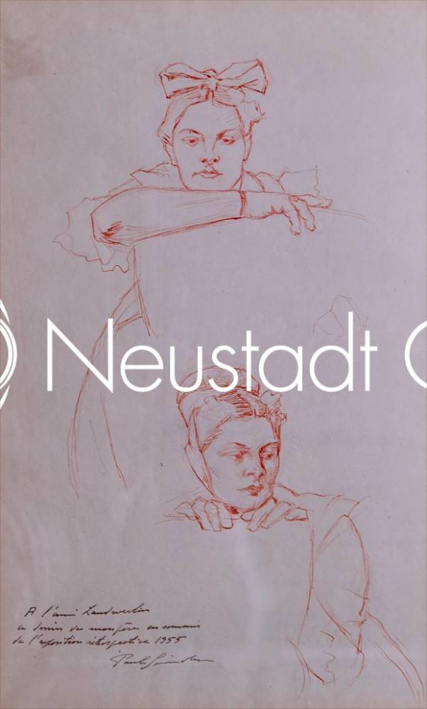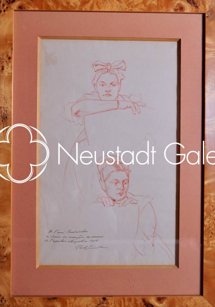 La feuille présente deux études de jeunes femmes en costume traditionnel, esquissées avec une grande économie de moyens. Le dessin supérieur montre une Alsacienne accoudée au dossier d’une chaise ou d’un panneau, son visage légèrement incliné vers l’avant. Le célèbre nœud monumental de la coiffe alsacienne, rendu par quelques lignes souples et nerveuses, structure la silhouette et attire immédiatement le regard. Le visage, traité avec une grande sobriété, révèle l’attention particulière que l’artiste porte à l’expression et à la douceur des traits.