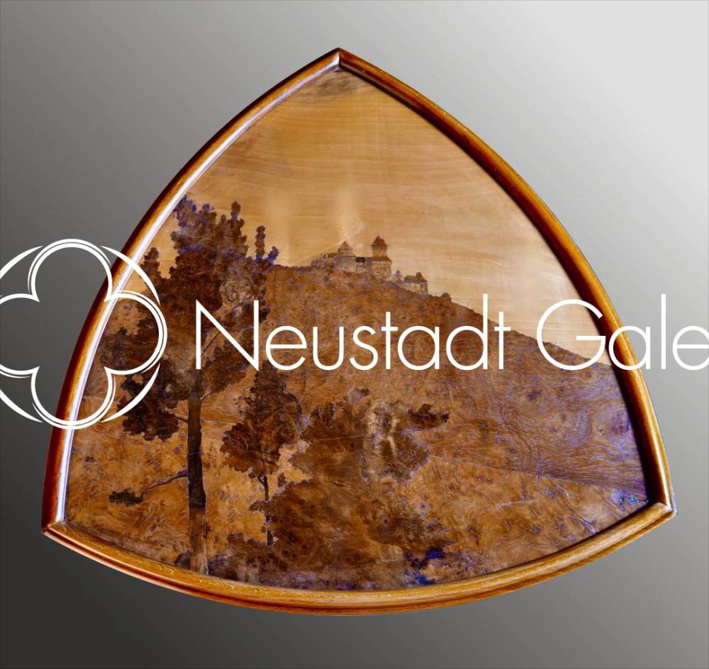 Le plateau, de forme trilobée ou en éventail, accueille une marqueterie paysagère d’une grande subtilité chromatique. Le château du Haut-Koenigsbourg, perché sur son éperon rocheux, domine la composition. Restauré à partir de 1900 sous l’impulsion impériale, le monument était devenu, au moment de l’exécution de ce guéridon, un symbole fort de l’histoire médiévale alsacienne et de son identité patrimoniale. Spindler choisit ici de représenter le château dans une vision panoramique, inscrit dans un paysage vallonné traité en larges nappes de bois soigneusement sélectionnés pour leurs veinages expressifs.