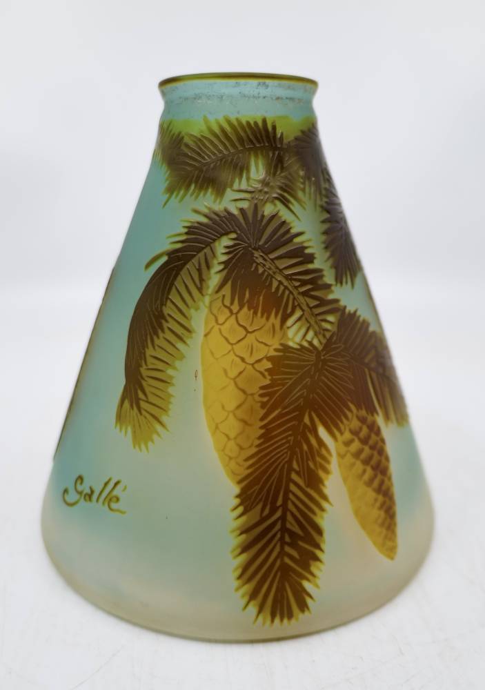 La signature « Gallé », visible sur la panse, atteste de cette production contrôlée et codifiée des ateliers nancéiens, où la maîtrise technique du camée sur verre atteint ici une remarquable finesse d’exécution. Le traitement des aiguilles de pin, rendu par une gravure incisive et rythmée, confère au décor une vibration graphique qui dialogue avec la translucidité du matériau.