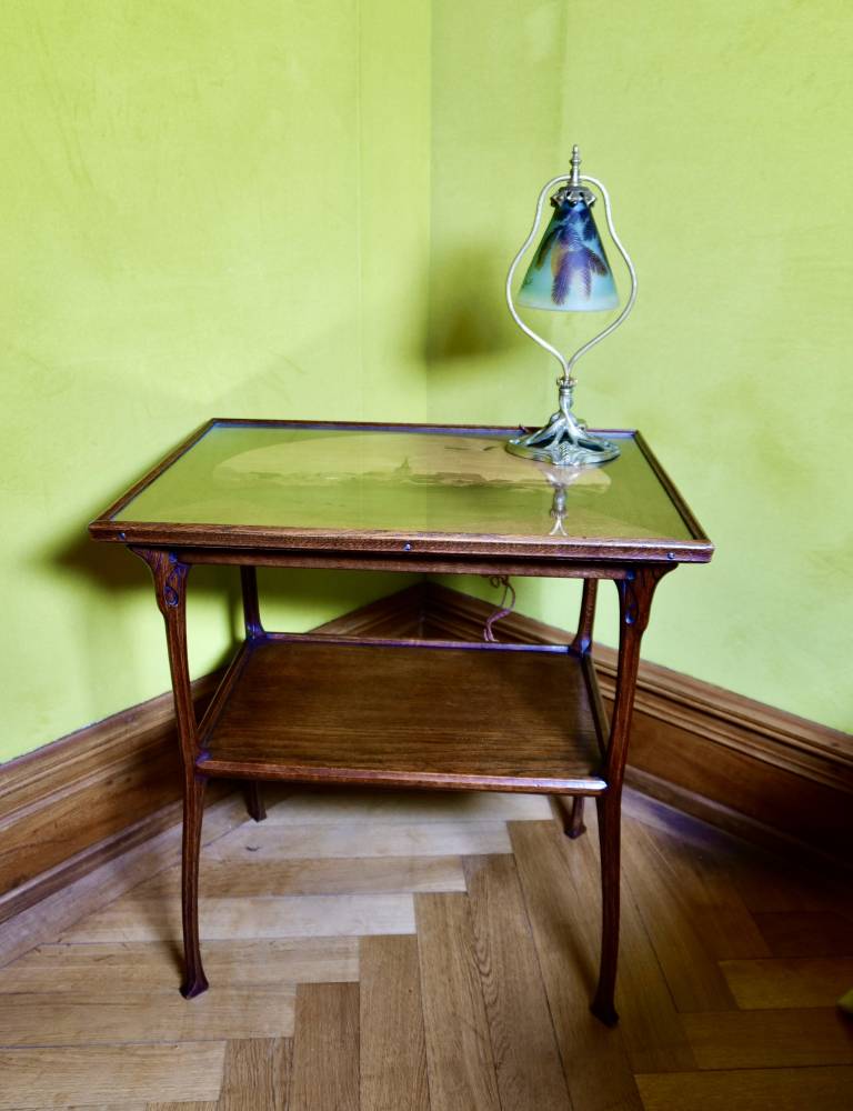 La monture en bronze doré, quant à elle, adopte un vocabulaire pleinement organique. Le piètement ajouré, aux lignes sinueuses et fluides, semble se développer comme un réseau de racines ou de tiges, ponctué de pommes de pin en relief qui font écho au décor de la tulipe. Cette continuité entre le verre et le métal traduit l’idéal d’unité des arts décoratifs propre à l’Art nouveau, où chaque élément participe d’un ensemble cohérent, sans hiérarchie entre structure et ornement.