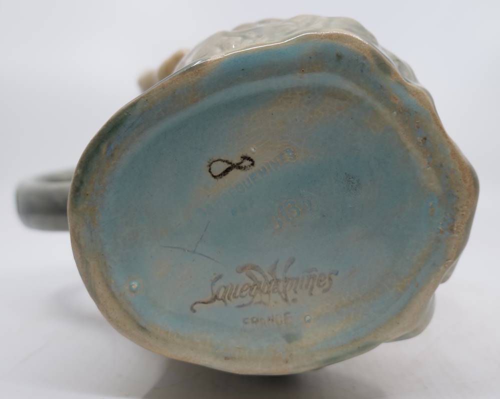 Numéro de forme : 3185. Marque sur le talon : "Sarreguemines France" et "3185" Un modèle similaire est conservé au Musée de la Faïence à Sarreguemines sous le numéro d'inventaire "89.15" (voir le lien) Etat de conservation : Cheveux et craquelures.