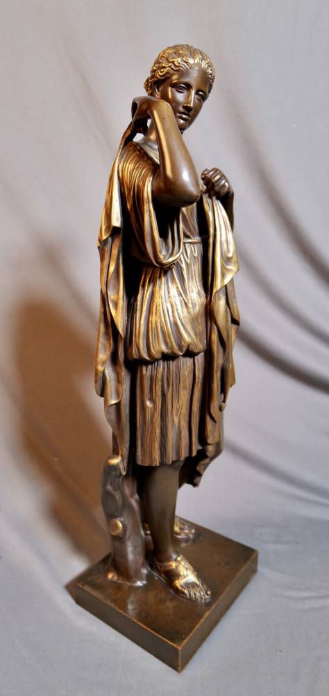 Cette grande figure féminine en bronze patiné — éditée par la prestigieuse fonderie F. Barbedienne et portant le poinçon Collas de réduction mécanique — représente manifestement une femme à l’antique, très directement inspirée de la célèbre Diane de Gabies, statue attribuée à l’entourage de Praxitèle et conservée au Louvre depuis le XVIIIᵉ siècle.