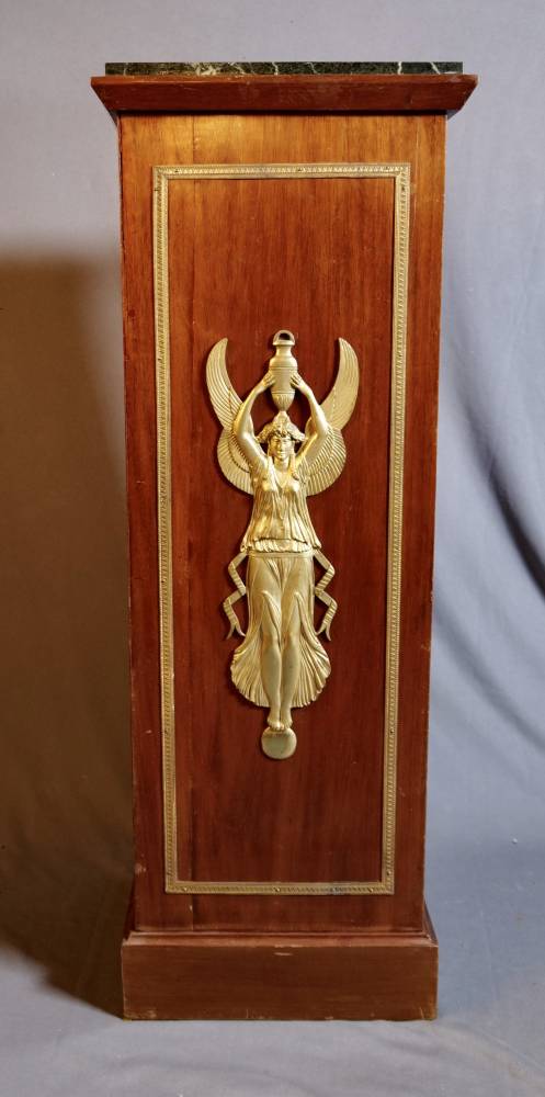 Cette gaine de style Empire, réalisée au début du XXᵉ siècle, constitue une élégante réinterprétation des modèles néoclassiques du Premier Empire, inspirés de la grandeur antique et de l’esthétique napoléonienne. Son dessin sobre et vertical, équilibré par une ornementation raffinée, traduit le goût historiciste propre à la période de la Belle Époque, au moment où les arts décoratifs français revisitent les grands styles du XIXᵉ siècle avec un savoir-faire renouvelé.La structure, en acajou verni, repose sur une plinthe moulurée et s’élève en un fût rectangulaire surmonté d’un plateau de marbre vert de mer, typique des garnitures Empire. La composition est articulée autour d’un panneau central encadré d’une frise dorée, où se détache un remarquable bronze doré figurant une Victoire ailée tenant un vase au-dessus de sa tête — motif emprunté au répertoire gréco-romain et largement popularisé sous Napoléon Ier. Ce symbole triomphal, d’une élégance hiératique, renvoie à l’imagerie du pouvoir impérial et à l’idéal héroïque qui irrigue tout le vocabulaire décoratif du style Empire.Sur les faces latérales, les ornements dorés — rosaces, losanges à médaillon, encadrements perlés — complètent un décor symétrique et ordonné, où l’or et l’acajou s’unissent dans une harmonie précieuse. L’exécution soignée des bronzes, à la ciselure nette et au poli brillant, témoigne du haut niveau des ateliers français du début du XXᵉ siècle, soucieux de reproduire avec exactitude la rigueur et la dignité du mobilier d’époque.Cette pièce, au-delà de sa fonction utilitaire, s’inscrit pleinement dans la renaissance des styles historiques qui marque les arts décoratifs français vers 1900 : elle illustre la persistance d’un goût pour la grandeur néoclassique et la symbolique impériale, tout en manifestant la finesse d’un artisanat déjà tourné vers la modernité par la pureté de ses lignes et la qualité de sa facture.Ainsi, cette gaine se présente comme un hommage érudit à l’esthétique impériale, à la croisée du mobilier d’apparat et de la relecture patrimoniale, fidèle à cet esprit de continuité stylistique qui caractérise le goût français du premier tiers du XXᵉ siècle.