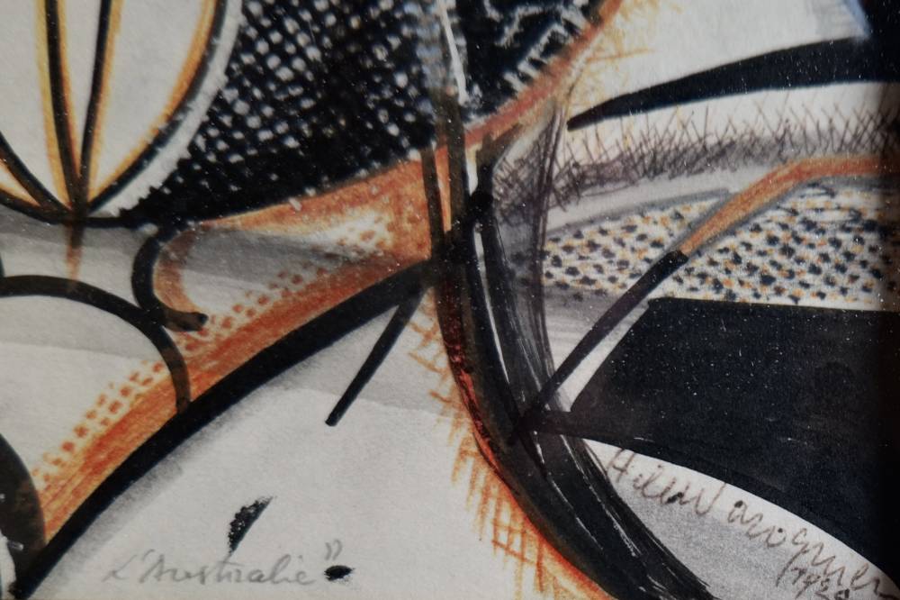 La palette, restreinte mais intensément contrastée, articule le noir profond, le blanc réservé du papier, et des accents de rouge brique et d’ocre chaud. Ces tonalités sont rehaussées par des trames et hachures au crayon, ainsi que par des aplats de gouache qui alternent opacité et translucidité. L’encre, incisive, impose la charpente formelle, tandis que le crayon apporte des modulations vibratoires, presque textiles, dans les zones d’ombre.