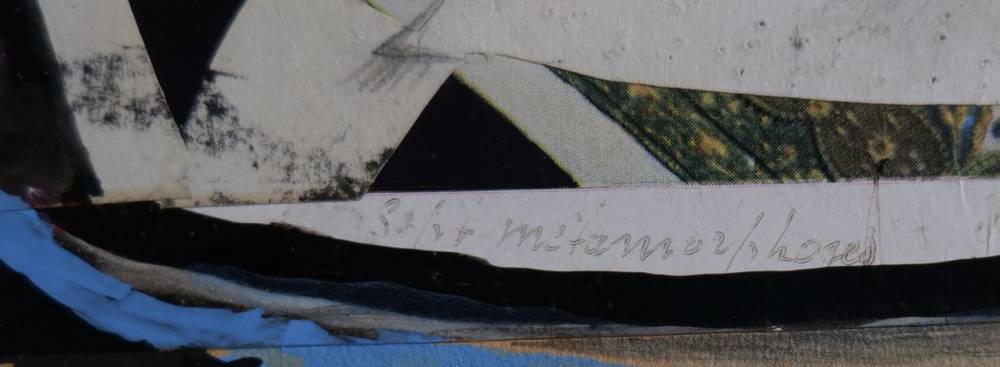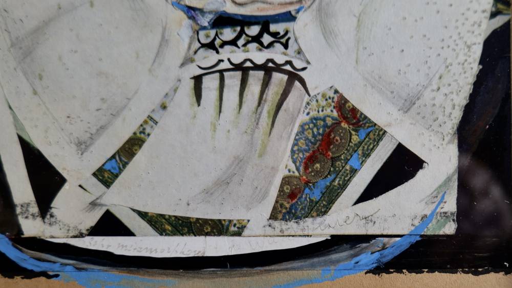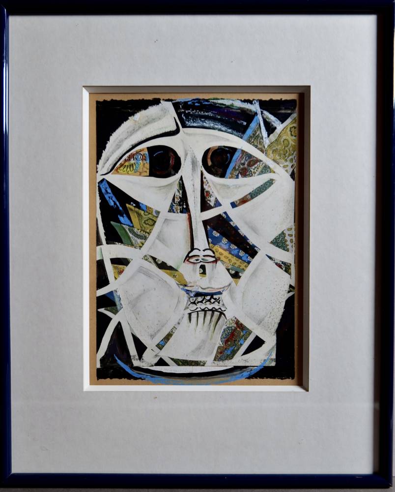 Le recours au collage confère à l’œuvre une dimension matérielle et polysémique. Des fragments de papiers imprimés, aux motifs ornementaux et floraux, s’insèrent dans les compartiments du visage, créant un contraste saisissant entre la blancheur presque minérale des volumes et la richesse chromatique des incrustations. Les bleus profonds, les verts nuancés, les ocres et les rouges vibrent sous la surface, comme si le visage révélait des strates de mémoire ou des éclats de visions intérieures. La matière picturale, travaillée à la gouache et rehaussée d’encre et de crayon, alterne zones lisses et passages plus nerveux, accentuant la tension expressive de l’ensemble.