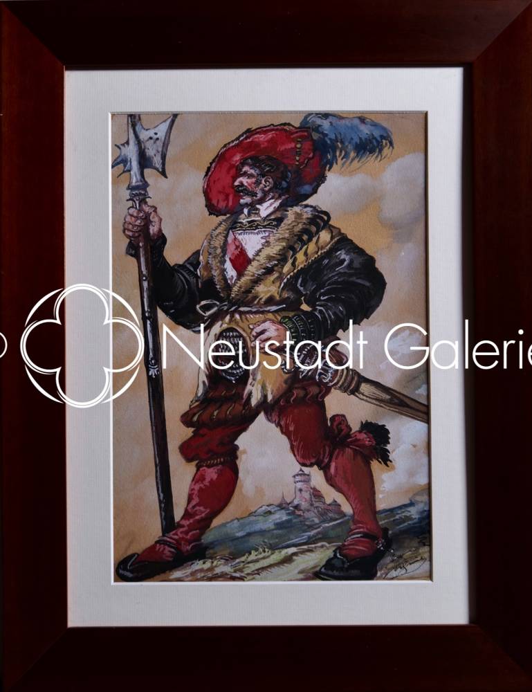 Léo SCHNUG "Hallebardier dans un paysage" aquarelle, 37,5x25,5cm (avec son cadre)