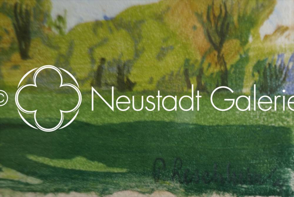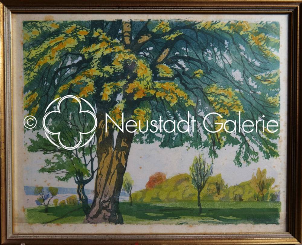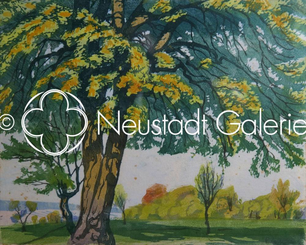 Au-delà de la simple représentation d’un paysage, l’artiste propose une véritable évocation poétique du renouveau printanier. L’arbre monumental du premier plan agit comme une figure tutélaire, incarnant la permanence de la nature tandis que les jeunes pousses et la lumière dorée du feuillage suggèrent le cycle éternel de la vie. Par l’équilibre de sa composition et la douceur de sa palette, cette estampe illustre parfaitement la capacité de Paul Leschhorn à transformer un motif simple en une méditation sensible sur la nature et le passage des saisons.
