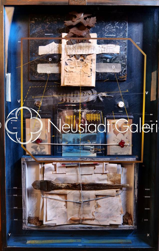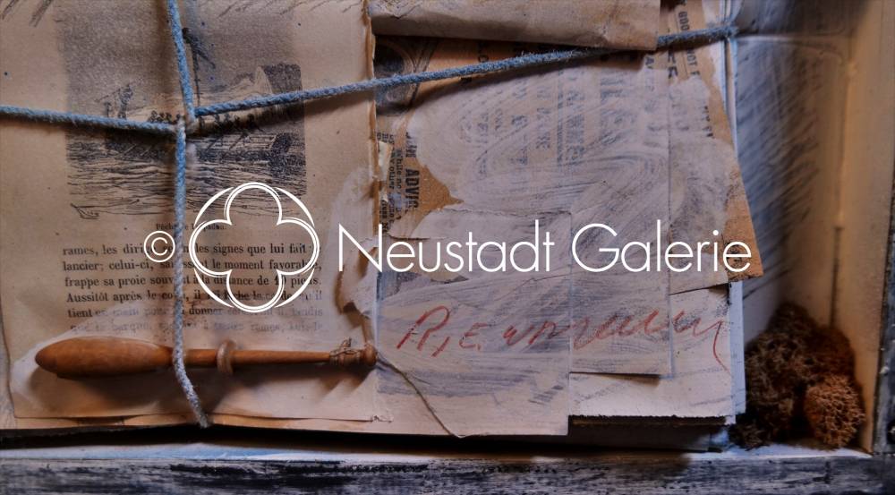 Assemblage (bois, papier, photo, livre, cuir (montre) métal (montre),crayon de couleur)
