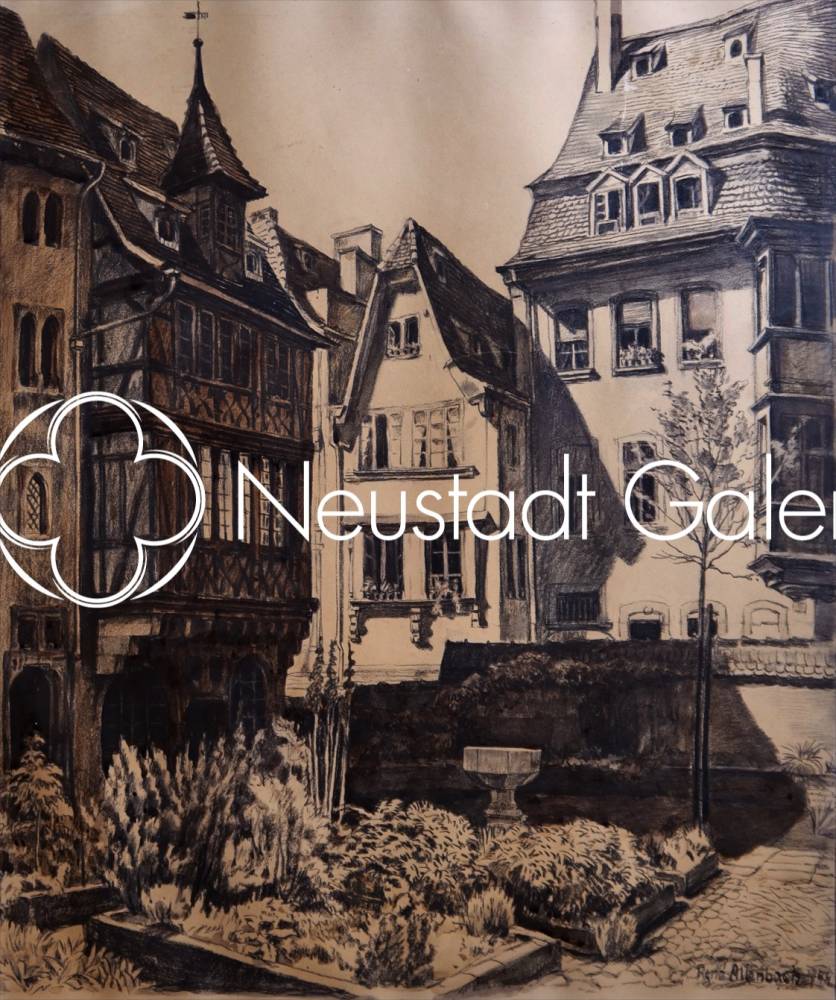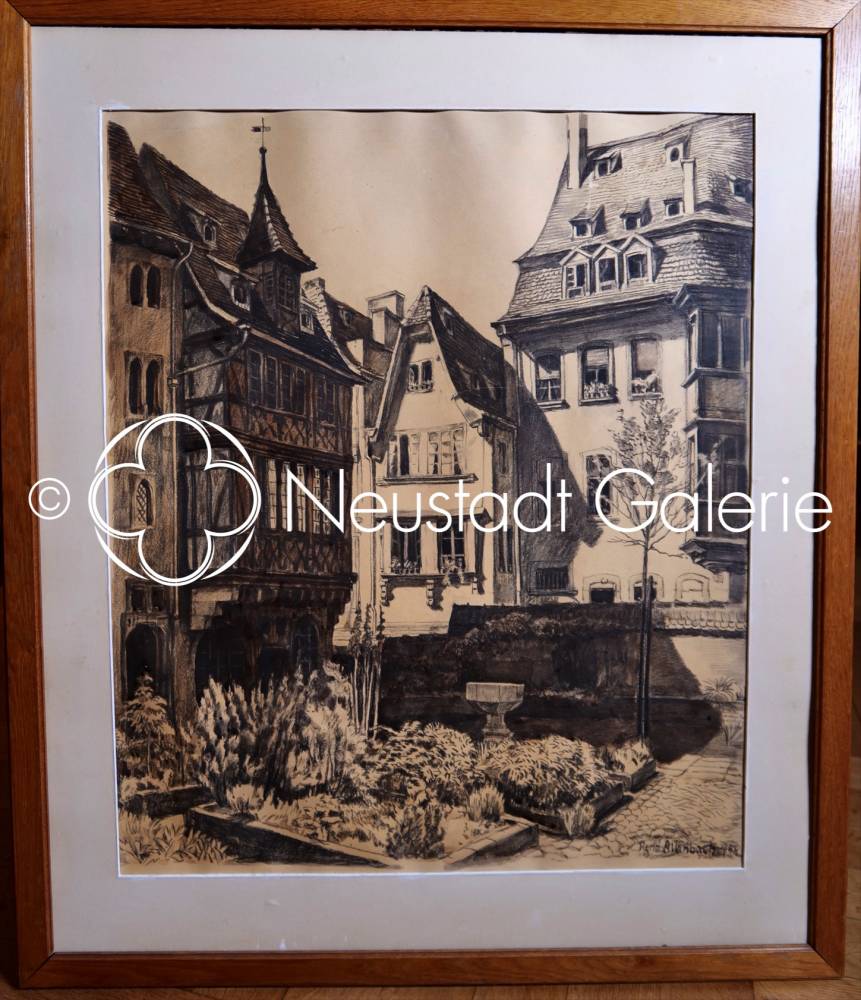 René ALLENBACH "Jardin gothique du musée de l'oeuvre Notre Dame à Strasbourg" Fusain (avec son cadre)