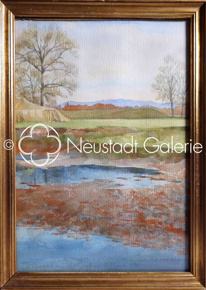 La composition se déploie selon une succession horizontale de plans : au premier plan, une étendue d’eau aux reflets bleu acier se mêle aux terres humides aux tonalités ocre et rouille ; plus loin, des prairies verdoyantes structurent l’espace, avant qu’une ligne de végétation et la silhouette lointaine du village ne viennent fermer l’horizon. À l’arrière-plan, une bande bleuâtre suggère les reliefs vosgiens, inscrivant la scène dans une profondeur douce et atmosphérique.