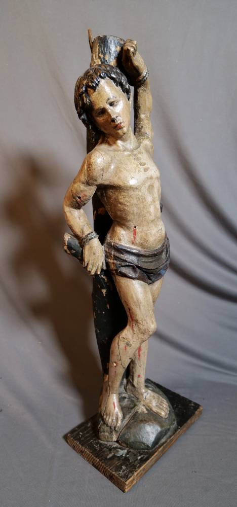 Le visage juvénile, d’une beauté presque androgine, incline doucement la tête vers la droite dans une expression de douleur contenue et de résignation mystique. Les lèvres entrouvertes, le regard abaissé et les mèches bouclées encadrant le front rappellent les figures de saints martyrs traitées par les sculpteurs flamands comme Artus Quellinus l’Ancien ou Lucas Faydherbe, héritiers du naturalisme de Rubens appliqué à la sculpture. Le traitement des chairs, légèrement vernissé, conserve des rehauts de polychromie d’origine ; les traces de sang stylisées ponctuant le torse et les jambes sont peintes d’un rouge vif, soulignant la tension entre l’esthétique et le pathétique.