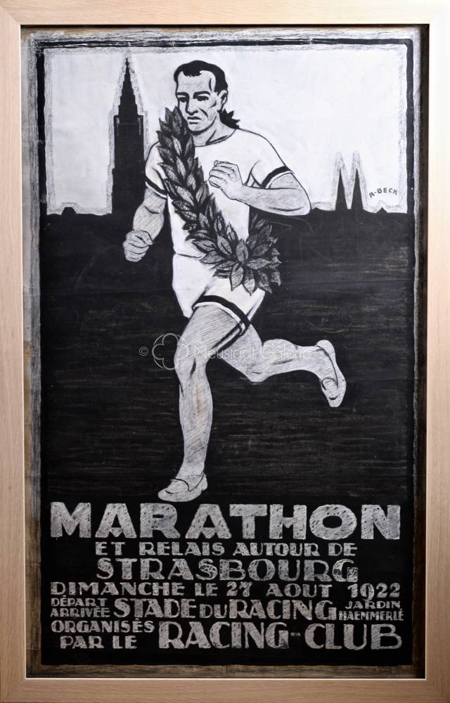 Projet original d'une affiche pour le marathon et relais de Strasbourg du 27 Août 1922. Organisé par le Racing Club Information(s) supplémentaire(s) : Cadre en bois naturel. Verre antireflet UV70.