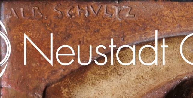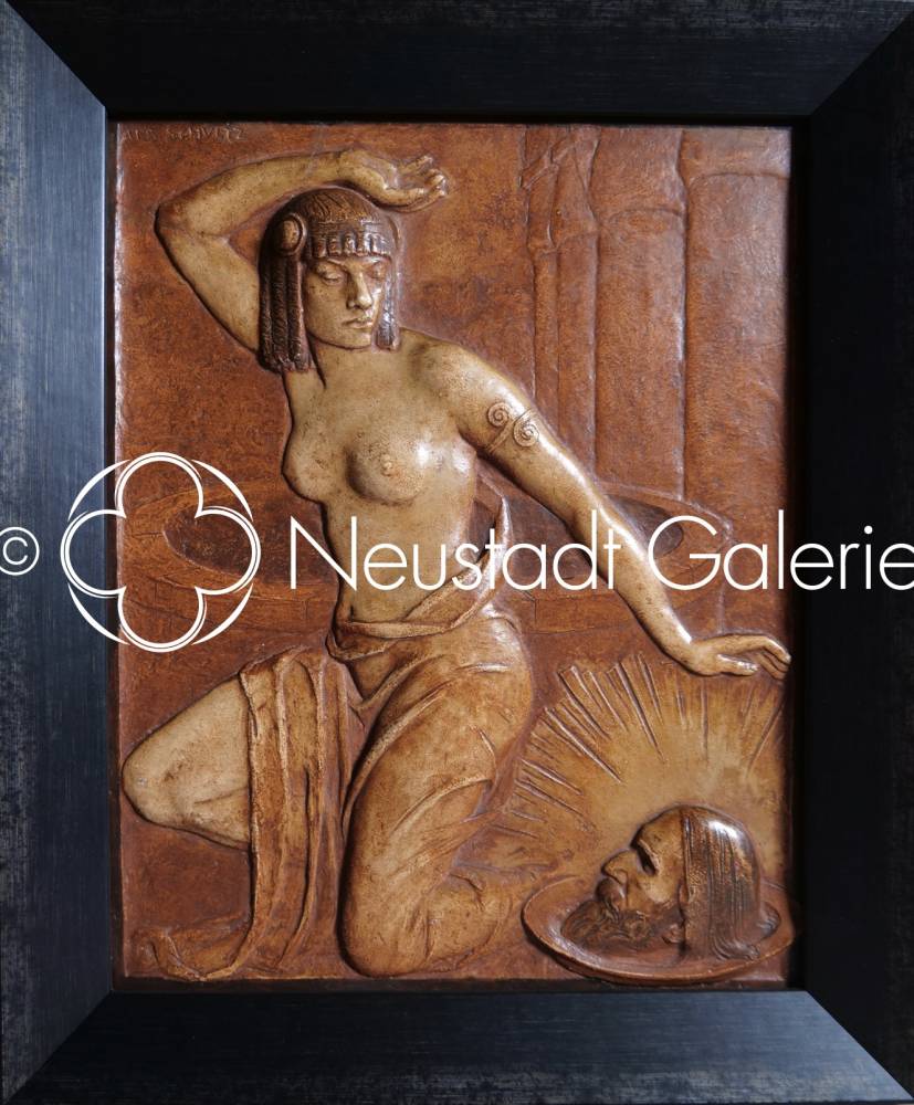 Ce bas-relief en plâtre patiné d’Albert Schultz, représentant Salomé, constitue un remarquable témoignage de l’esthétique symboliste et décadente qui imprègne une partie de la sculpture française et rhénane du début du XXᵉ siècle. L’artiste y interprète avec une puissance contenue le célèbre épisode biblique où Salomé, figure de séduction fatale, présente la tête de Saint Jean-Baptiste, posée ici dans un nimbe rayonnant qui contraste avec la sensualité charnelle du corps féminin.