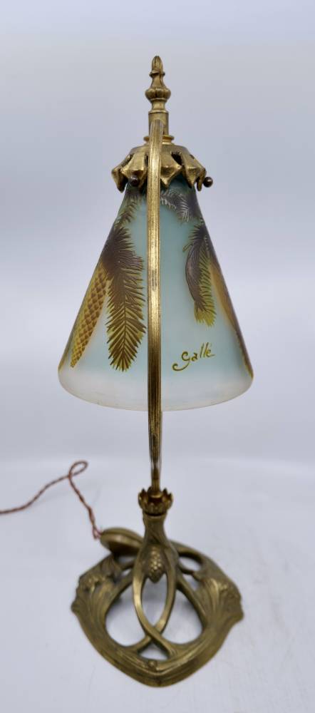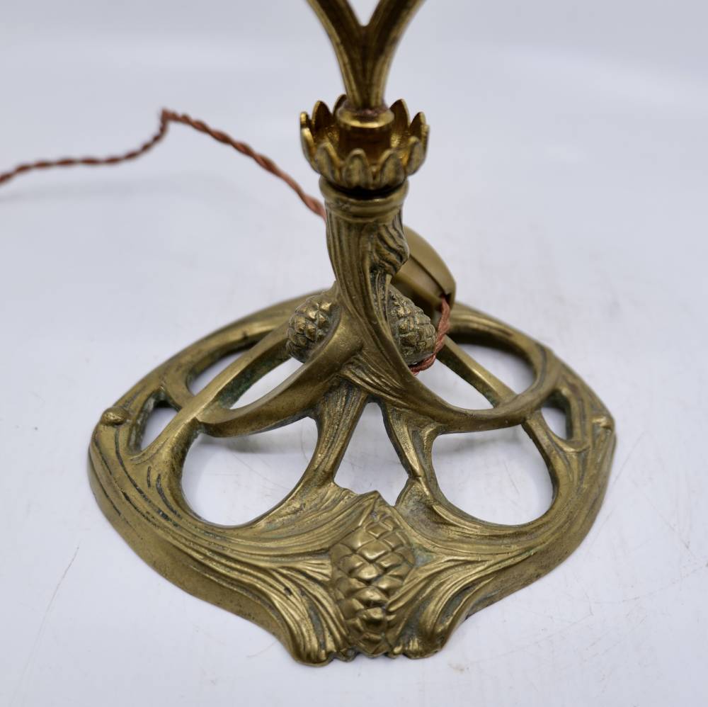 La monture en bronze doré, quant à elle, adopte un vocabulaire pleinement organique. Le piètement ajouré, aux lignes sinueuses et fluides, semble se développer comme un réseau de racines ou de tiges, ponctué de pommes de pin en relief qui font écho au décor de la tulipe. Cette continuité entre le verre et le métal traduit l’idéal d’unité des arts décoratifs propre à l’Art nouveau, où chaque élément participe d’un ensemble cohérent, sans hiérarchie entre structure et ornement.