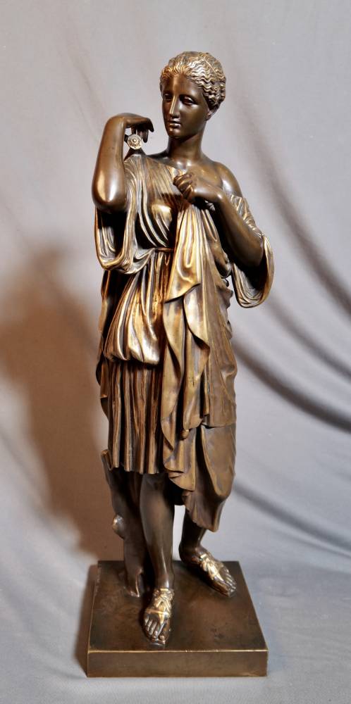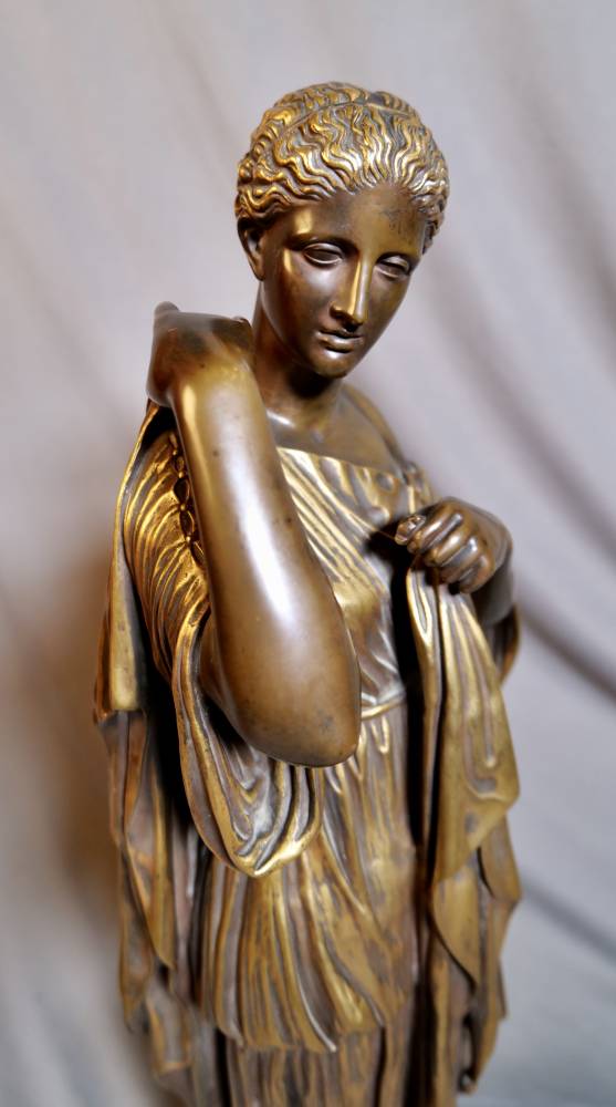 Cette grande figure féminine en bronze patiné — éditée par la prestigieuse fonderie F. Barbedienne et portant le poinçon Collas de réduction mécanique — représente manifestement une femme à l’antique, très directement inspirée de la célèbre Diane de Gabies, statue attribuée à l’entourage de Praxitèle et conservée au Louvre depuis le XVIIIᵉ siècle.