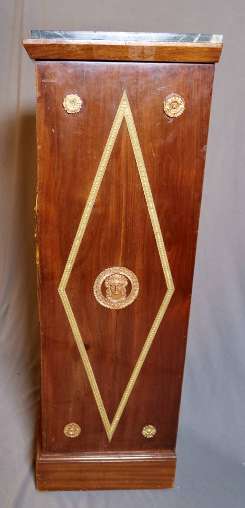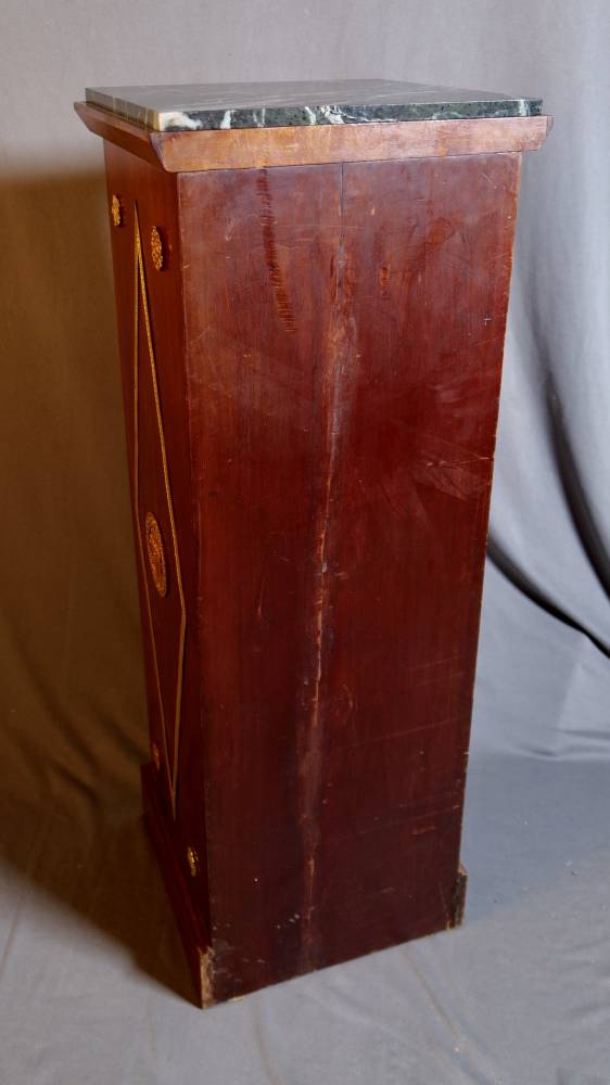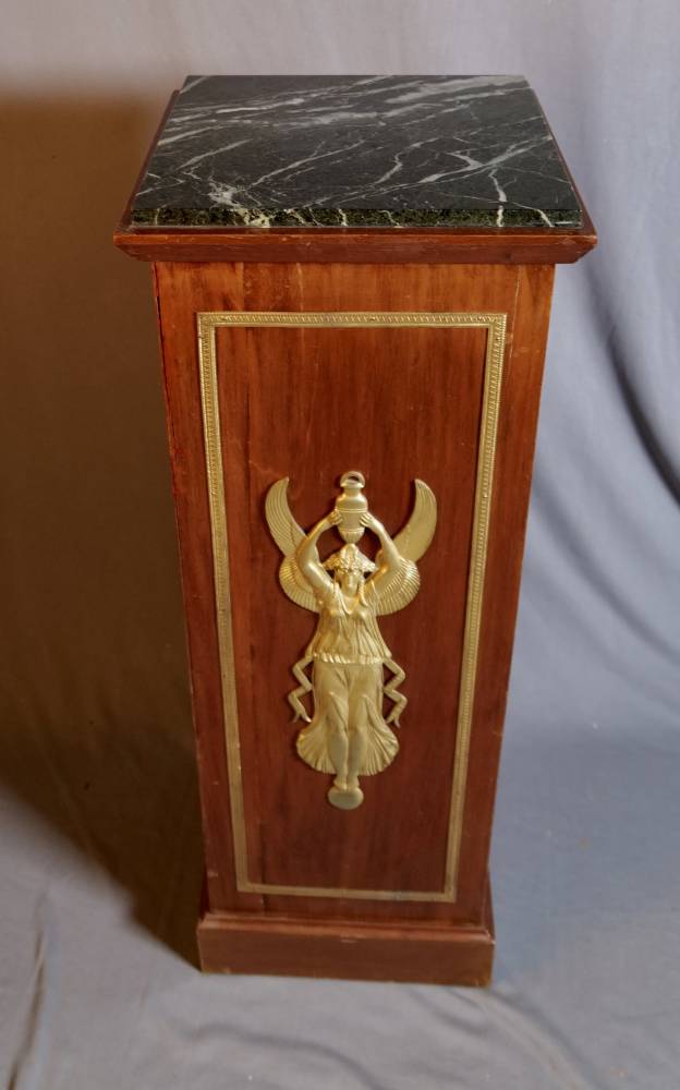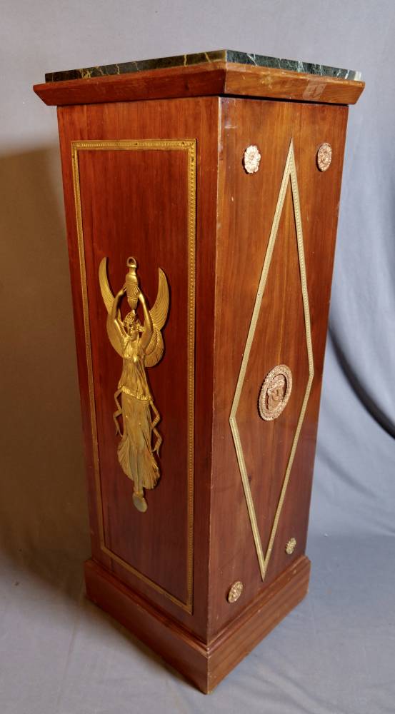 Cette gaine de style Empire, réalisée au début du XXᵉ siècle, constitue une élégante réinterprétation des modèles néoclassiques du Premier Empire, inspirés de la grandeur antique et de l’esthétique napoléonienne. Son dessin sobre et vertical, équilibré par une ornementation raffinée, traduit le goût historiciste propre à la période de la Belle Époque, au moment où les arts décoratifs français revisitent les grands styles du XIXᵉ siècle avec un savoir-faire renouvelé.La structure, en acajou verni, repose sur une plinthe moulurée et s’élève en un fût rectangulaire surmonté d’un plateau de marbre vert de mer, typique des garnitures Empire. La composition est articulée autour d’un panneau central encadré d’une frise dorée, où se détache un remarquable bronze doré figurant une Victoire ailée tenant un vase au-dessus de sa tête — motif emprunté au répertoire gréco-romain et largement popularisé sous Napoléon Ier. Ce symbole triomphal, d’une élégance hiératique, renvoie à l’imagerie du pouvoir impérial et à l’idéal héroïque qui irrigue tout le vocabulaire décoratif du style Empire.Sur les faces latérales, les ornements dorés — rosaces, losanges à médaillon, encadrements perlés — complètent un décor symétrique et ordonné, où l’or et l’acajou s’unissent dans une harmonie précieuse. L’exécution soignée des bronzes, à la ciselure nette et au poli brillant, témoigne du haut niveau des ateliers français du début du XXᵉ siècle, soucieux de reproduire avec exactitude la rigueur et la dignité du mobilier d’époque.Cette pièce, au-delà de sa fonction utilitaire, s’inscrit pleinement dans la renaissance des styles historiques qui marque les arts décoratifs français vers 1900 : elle illustre la persistance d’un goût pour la grandeur néoclassique et la symbolique impériale, tout en manifestant la finesse d’un artisanat déjà tourné vers la modernité par la pureté de ses lignes et la qualité de sa facture.Ainsi, cette gaine se présente comme un hommage érudit à l’esthétique impériale, à la croisée du mobilier d’apparat et de la relecture patrimoniale, fidèle à cet esprit de continuité stylistique qui caractérise le goût français du premier tiers du XXᵉ siècle.
