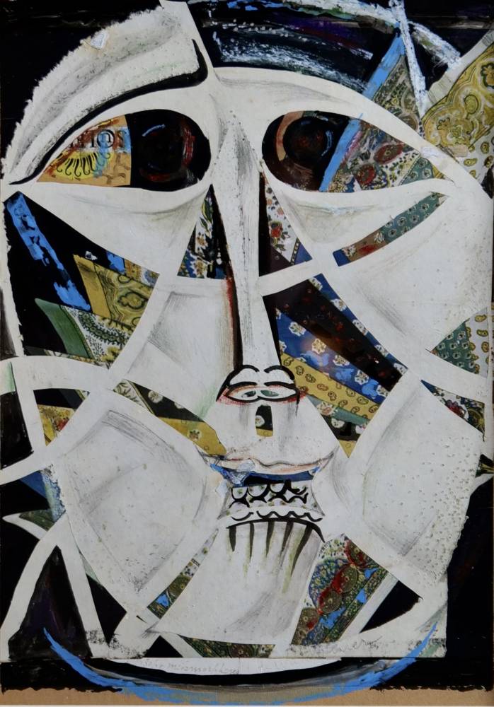 Le recours au collage confère à l’œuvre une dimension matérielle et polysémique. Des fragments de papiers imprimés, aux motifs ornementaux et floraux, s’insèrent dans les compartiments du visage, créant un contraste saisissant entre la blancheur presque minérale des volumes et la richesse chromatique des incrustations. Les bleus profonds, les verts nuancés, les ocres et les rouges vibrent sous la surface, comme si le visage révélait des strates de mémoire ou des éclats de visions intérieures. La matière picturale, travaillée à la gouache et rehaussée d’encre et de crayon, alterne zones lisses et passages plus nerveux, accentuant la tension expressive de l’ensemble.