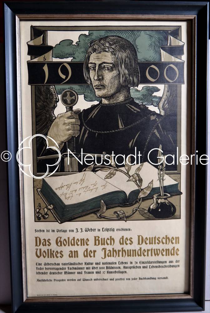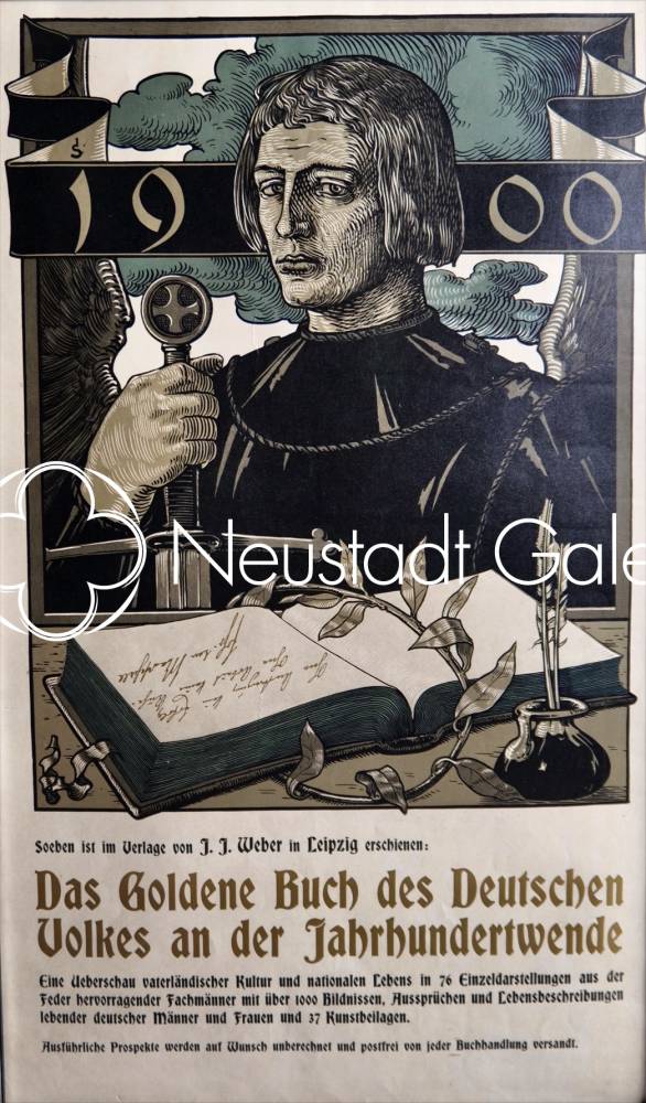 Cette remarquable affiche de Joseph Sattler, datée de 1900, constitue un témoignage emblématique de l’esthétique graphique germanique au tournant du siècle, à la croisée du symbolisme, du Jugendstil et d’un historicisme nourri d’idéal national. Réalisée pour la promotion de l’ouvrage Das Goldene Buch des Deutschen Volkes an der Jahrhundertwende, elle dépasse largement la fonction publicitaire pour s’imposer comme une véritable œuvre d’art autonome.