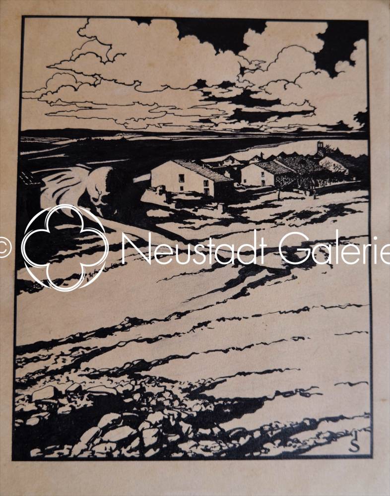 Cette œuvre à l’encre de Joseph Sattler s’inscrit dans la veine la plus saisissante et symboliste de son œuvre graphique, où le paysage devient le théâtre d’une méditation sur le temps, la mort et la condition humaine. Loin d’une simple vue topographique, l’artiste propose ici une composition profondément ambivalente, à la fois descriptive et allégorique.