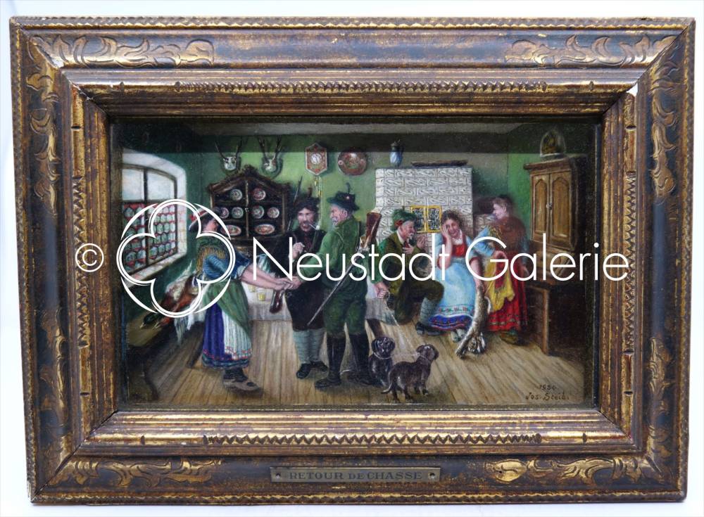 Tout en célébrant la sociabilité villageoise, Steib saisit les tensions subtiles entre travail, chasse, séduction et rituels du retour au foyer. Son pinceau précis, soucieux du détail ethnographique sans jamais sombrer dans l’illustration, s’inscrit dans la lignée des peintres alsaciens de genre — de Seebach à Hansi — mais avec une verve plus populaire, presque jubilatoire. La lumière diffuse, filtrant par la fenêtre aux vitraux colorés, confère à la scène un caractère domestique et intemporel.