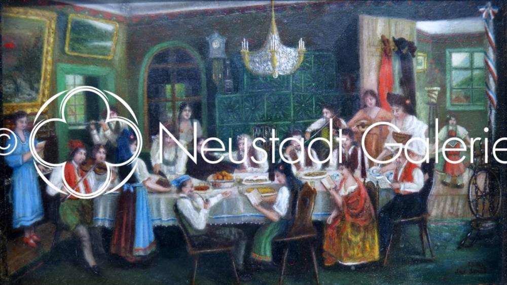 Au centre de la composition, un couple d’aînés — vraisemblablement les jubilaires — trône à une longue table blanche, entouré de proches venus partager le repas de fête. Leur posture légèrement penchée, le regard mi-fatigué mi-ému, suggère à la fois la dignité tranquille de l’âge et la tendresse d’une vie commune célébrée publiquement. Autour d’eux, Steib met en scène une communauté villageoise animée : jeunes femmes en costumes traditionnels brodés, serveuses affairées, convives lisant des feuillets ou devisant, musiciens jouant du violon, de la mandoline, voire du piano. À gauche comme à droite, les figures musicales encadrent la scène et lui confèrent une structure presque chorale, rappelant l’importance du chant populaire dans les rituels de passage.
