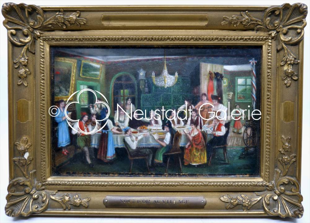 Cette petite huile sur panneau (13 × 21 cm), signée et datée « 1935 – Jos. Steib » en bas à droite, intitulée Noce d’or au village et exposée au Salon des Artistes Français de 1936 — comme l’attestent les étiquettes conservées au revers — constitue l’un des témoignages les plus éloquents du talent narratif et ethnographique de Joseph Steib (1898-1966). Malgré son format modeste, l’œuvre déploie une scène foisonnante où s’entrelacent célébration, mémoire collective et sociabilité rurale, caractéristiques essentielles de la peinture de genre alsacienne de l’entre-deux-guerres.