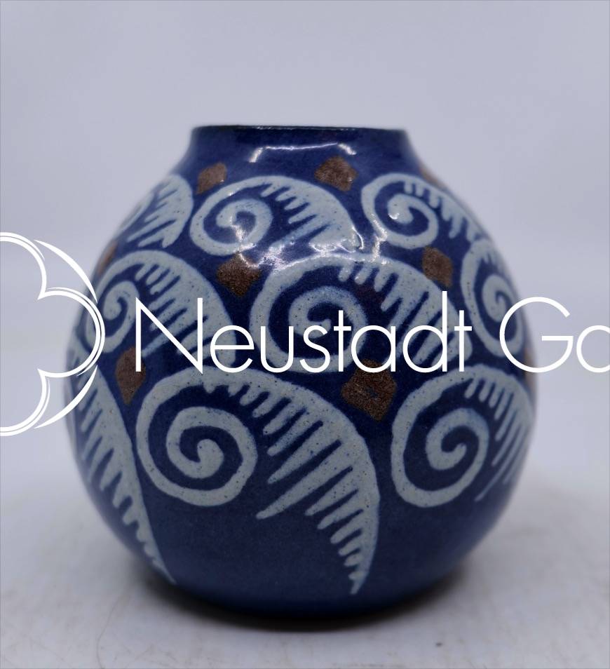 Léon ELCHINGER "Vase ovoïde à décor de spirales sur fon bleu" céramique, hauteur : 9,5cm - vers 1920 et 1934 (marque)