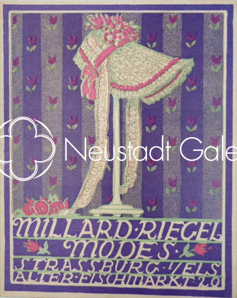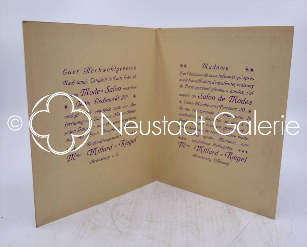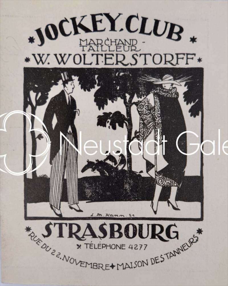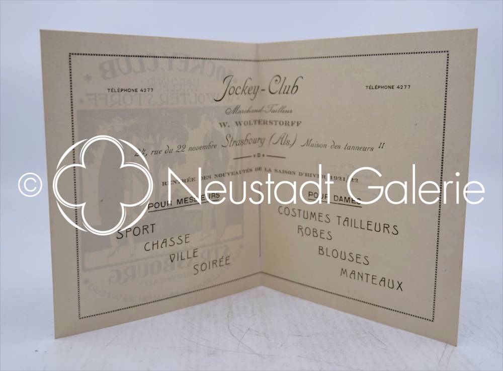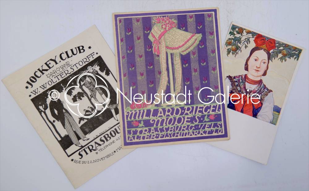 Lot de trois rares documents de Louis-Philippe KAMM, à savoir un carton d'invitation de la maison "Milliard - Riegel Strasbourg" de 1913 (Format fermé : 15x12cm), carte postale "Type d'Alsacienne d'Oberseebach" (format : 13,8x9cm) et une publicité du Jockey-Club de Strasbourg de 1921 (format fermé : 14x11,4cm).
