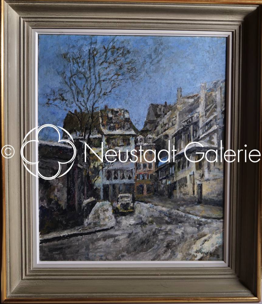 L’architecture, traitée par touches rapides et nerveuses, s’organise autour d’un axe central qui guide le regard vers une succession de façades aux toitures pentues, typiques du tissu urbain strasbourgeois. Les bâtiments, légèrement inclinés par le jeu de la perspective, vibrent sous l’effet d’une matière picturale libre, presque fragmentée, où les plans ne sont jamais rigidement définis. Cette instabilité formelle participe à l’impression de vie et de mouvement qui traverse la composition.