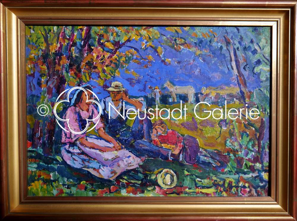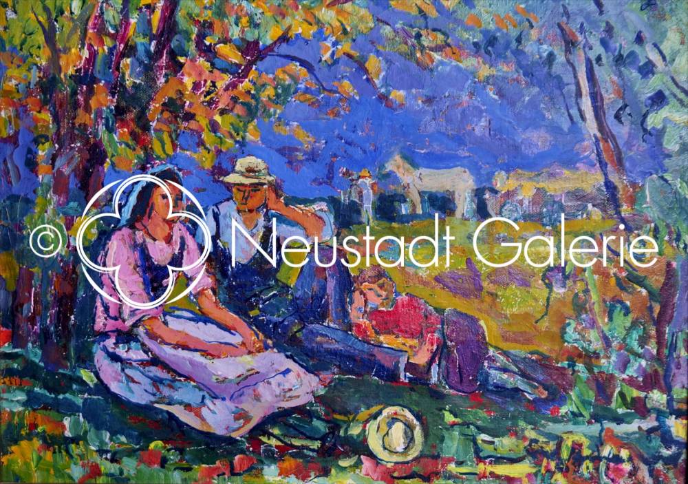 Cette huile sur toile de Lucien Binaepfel, s’inscrit pleinement dans la veine humaniste et post-impressionniste qui caractérise la maturité de l’artiste. La scène représente un moment suspendu de la vie rurale : un couple de paysans, accompagné d’un enfant, s’accorde une halte à l’ombre des arbres, tandis qu’au second plan paissent tranquillement des bovins dans un paysage ouvert.