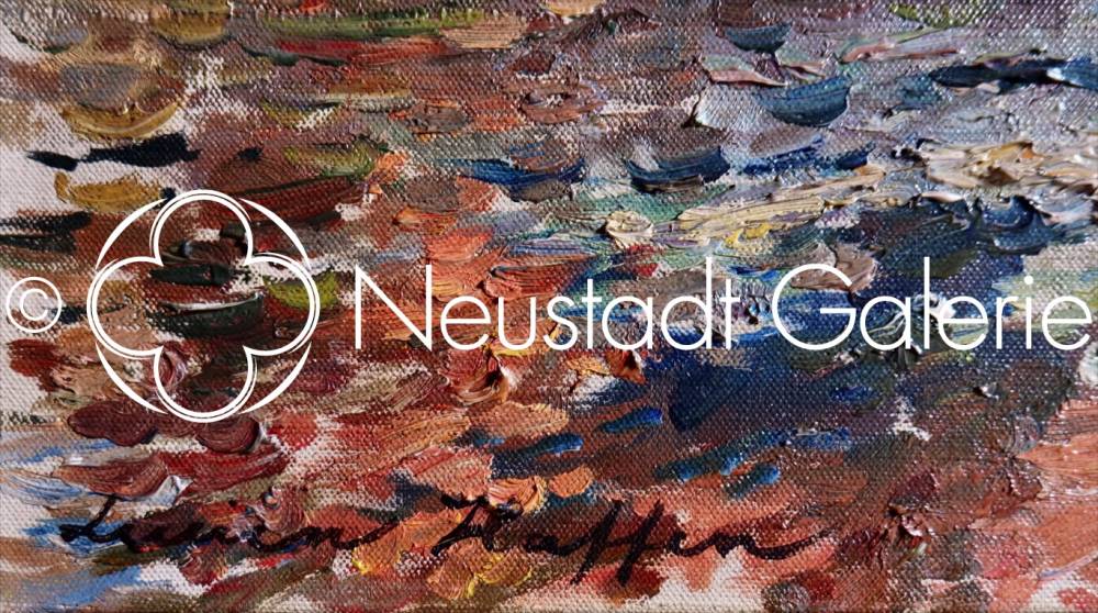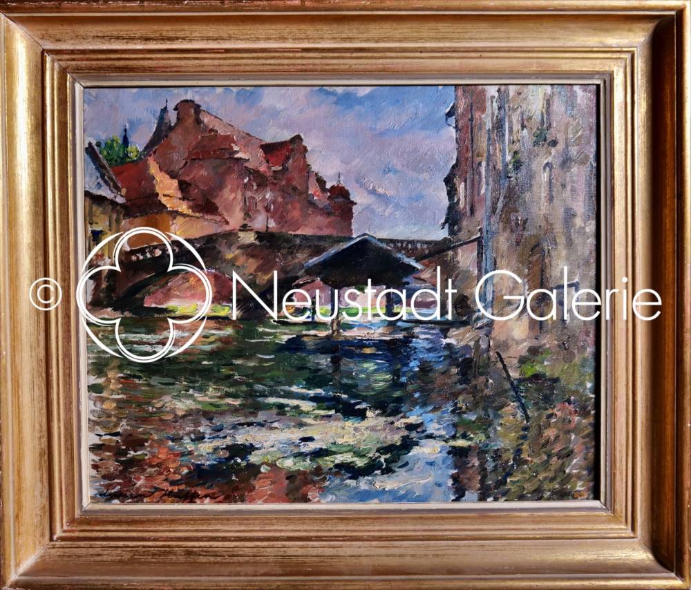 La palette de Haffen se révèle ici particulièrement nuancée : les ocres rosés et les bruns chauds des maçonneries dialoguent avec les verts profonds, les bleus et les touches nacrées de l’Ill. Les reflets, fragmentés par une touche vibrante et libre, témoignent d’une sensibilité post-impressionniste affirmée. La matière picturale, parfois épaisse, parfois plus diluée, confère à la scène une vibration constante, traduisant l’humidité de l’air et le mouvement imperceptible de l’eau sous le pont.