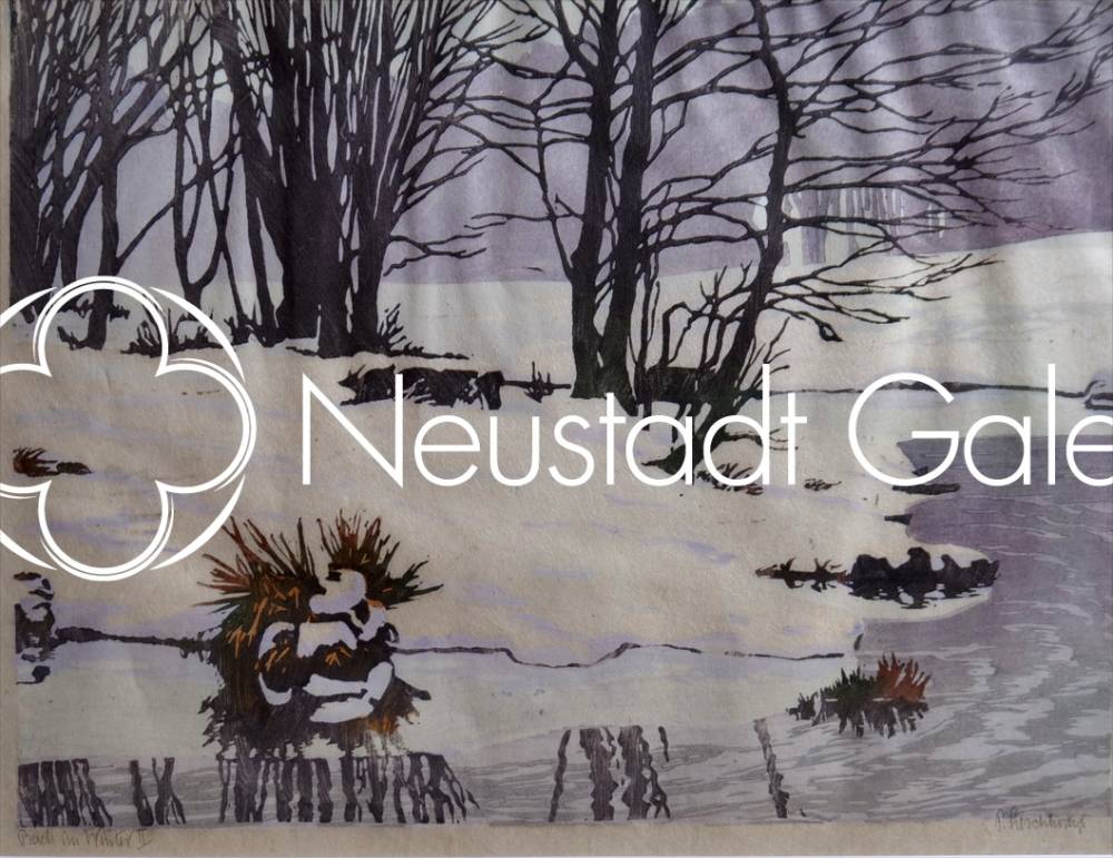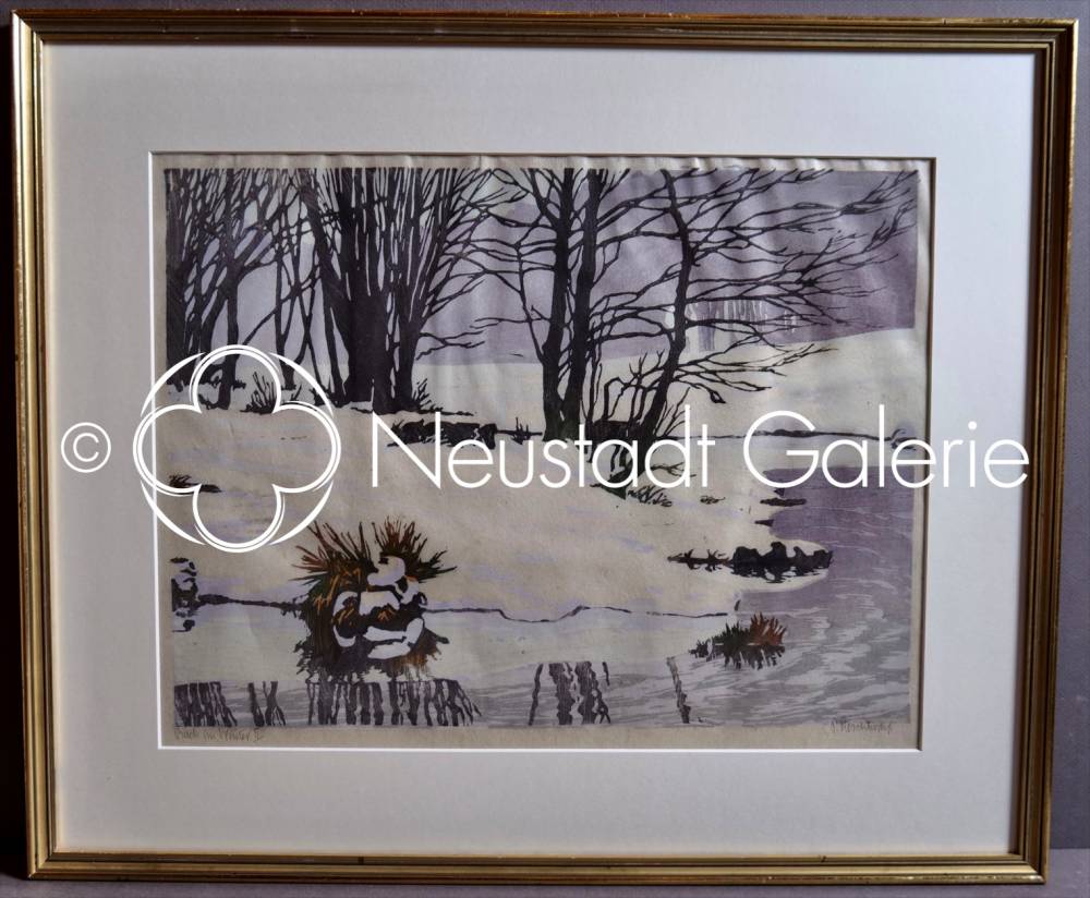 Cette estampe de Paul Leschhorn s’inscrit avec une grande cohérence dans le renouveau de l’estampe au tout début du XXᵉ siècle, à un moment où les artistes européens redécouvrent et assimilent profondément les principes esthétiques de l’art japonais. Le sujet — un paysage hivernal silencieux, structuré par des arbres dénudés, la neige et l’eau figée — relève d’une iconographie familière à Leschhorn, puisée dans les paysages alsaciens qu’il observe et transcrit avec une sensibilité toute particulière.