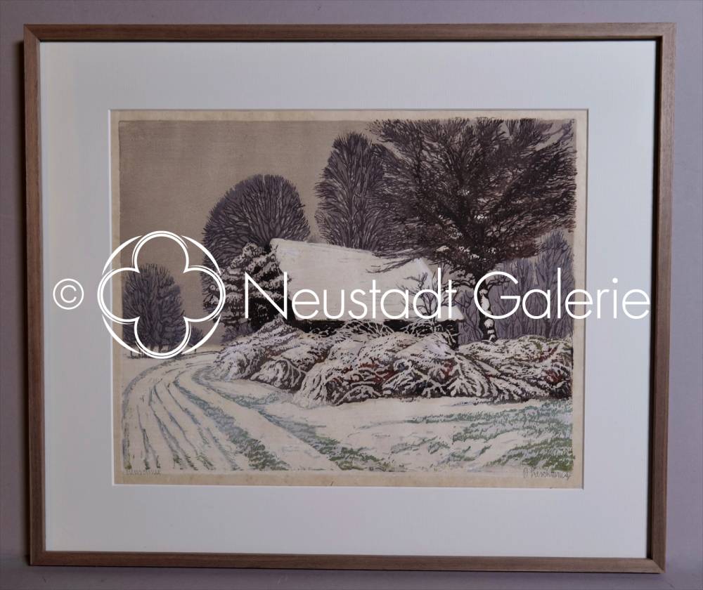 Paul LESCHHORN "Maison et chemin sous la neige" estampe, 31x39cm (à vue) - avec son cadre