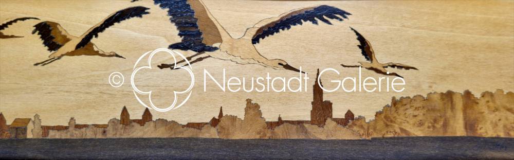 Spindler "Vol de cignognes au dessus de Strasbourg" marqueterie, 18,5x43cm (détail)