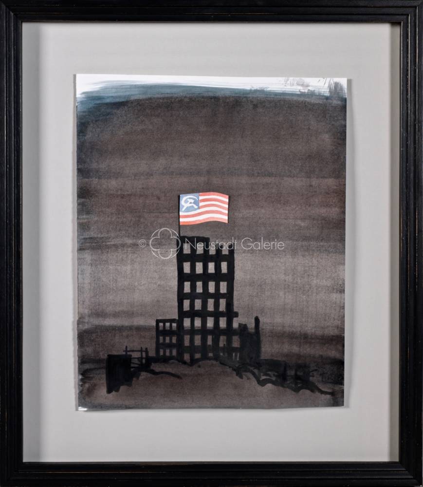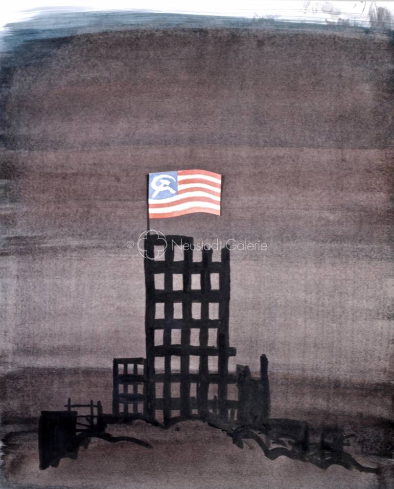 L’illustrateur Tomi Ungerer livre à travers cette aquarelle une savoureuse illustration, mêlant histoire, satire et politique. Un mélange qui scie à merveille à ce mordant illustrateur alsacien, qui a passé sa vie, à l’aide de crayon et de pinceau, à détricoter, à chambouler et àn réinventer un univers martelé par son esprit sarcastique.