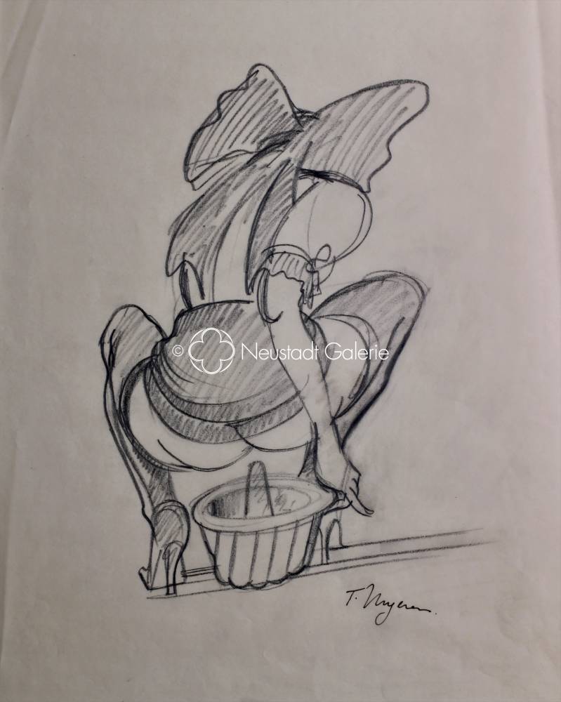 Le dessin préparatoire ou d’accompagnement éclaire cette démarche. D’un trait libre, nerveux et volontairement caricatural, Ungerer met en scène une figure féminine dont la posture suggère une interaction avec l’objet transformé. Le traitement graphique, à la fois rapide et expressif, accentue le caractère ludique et subversif de l’ensemble. On retrouve ici le vocabulaire visuel propre à l’artiste : exagération des formes, humour grinçant, et une certaine crudité assumée dans l’évocation du corps et du désir.