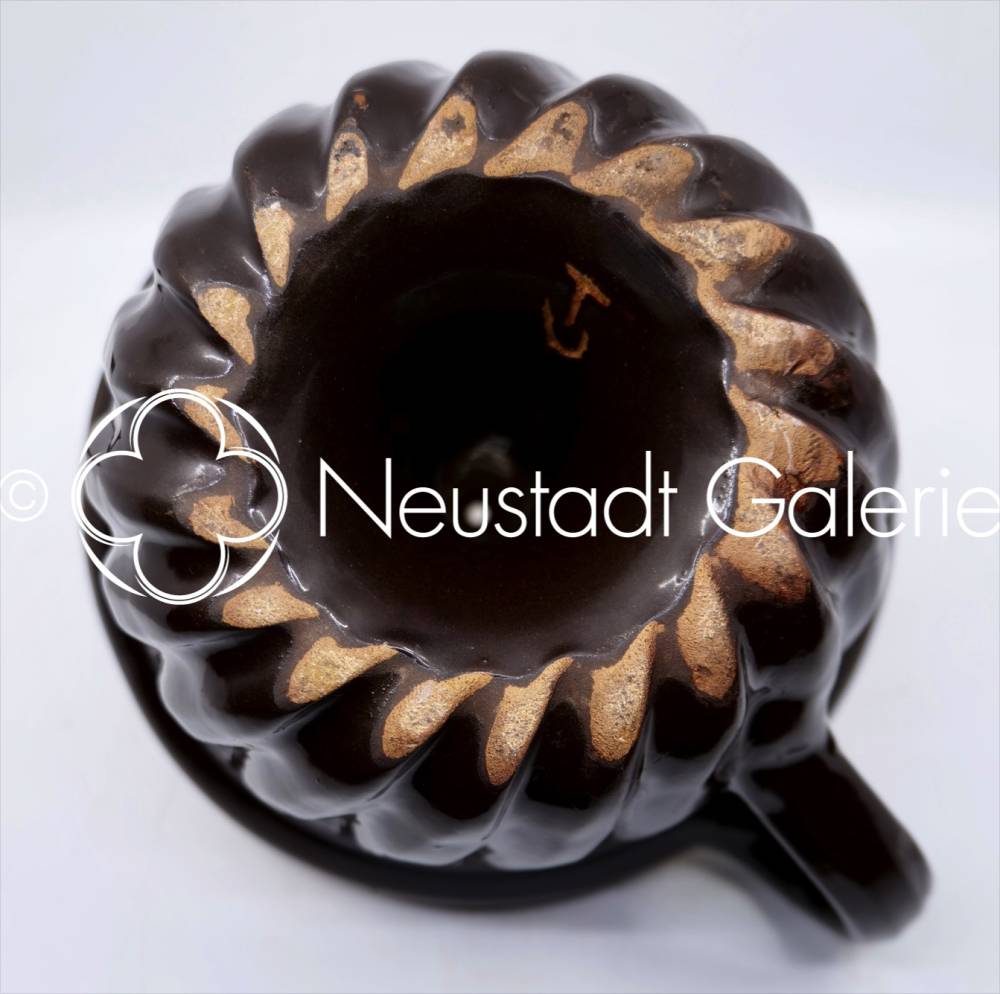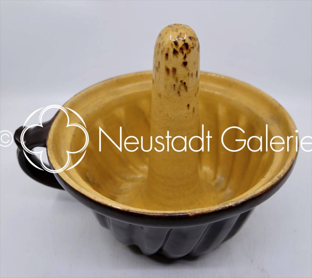 Le moule, en céramique vernissée, conserve sa forme traditionnelle cannelée et sa teinte brun profond à l’extérieur, contrastant avec un émail intérieur jaune. Toutefois, l’élément central, normalement modeste et fonctionnel, est ici exagérément développé, adoptant une forme verticale, lisse et dominante. Cette transformation confère à l’objet une dimension explicitement symbolique, où la fonction utilitaire bascule vers une lecture corporelle et sexuelle. Le geste de l’artiste est simple mais d’une efficacité redoutable : il ne crée pas un objet nouveau, il altère un objet existant, révélant ainsi la charge potentielle de formes que notre regard tend habituellement à neutraliser.